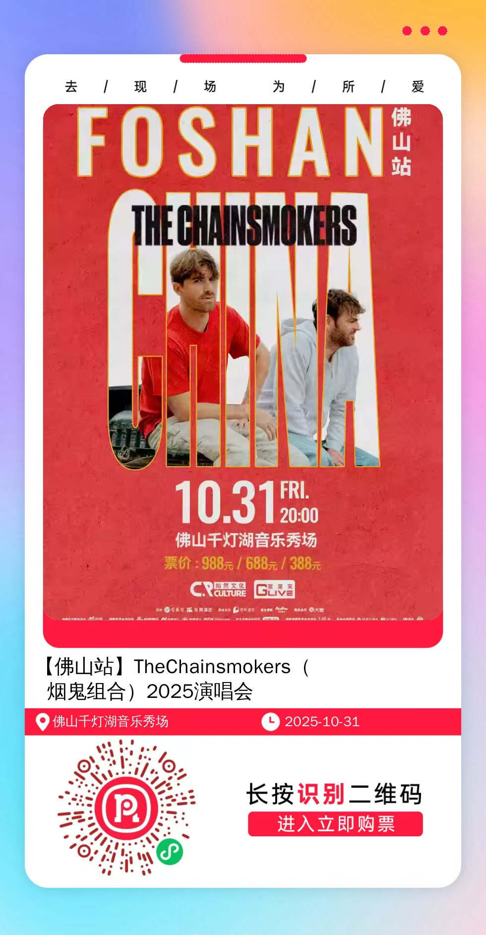 购票提醒:直接打开左侧海报(鼠标移动到海报上,右键选择“在新标签页打开图片”),用手机打开微信扫描海报中的二维码,扫描之后手机登录即可购票。如有疑问,可加微信cary7790咨询,下单后全程跟单,跟进一切关于门票的问题。