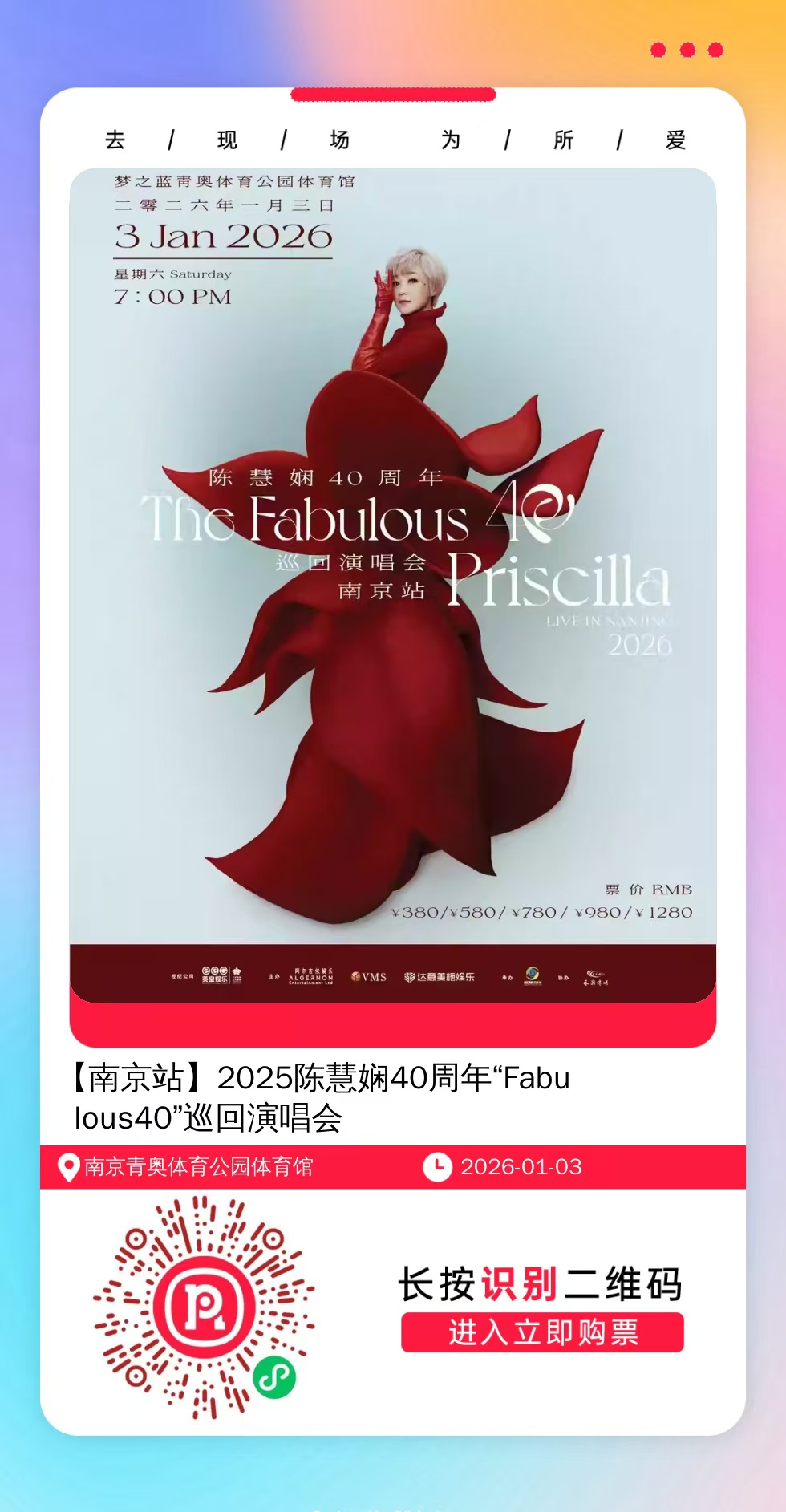 购票提醒:将左侧海报保存至手机,打开微信扫一扫,选择手机相册中保存的海报,扫描之后手机登录即可购票。如有疑问,可加微信cary7790咨询,下单后全程跟单,跟进一切关于门票的问题。