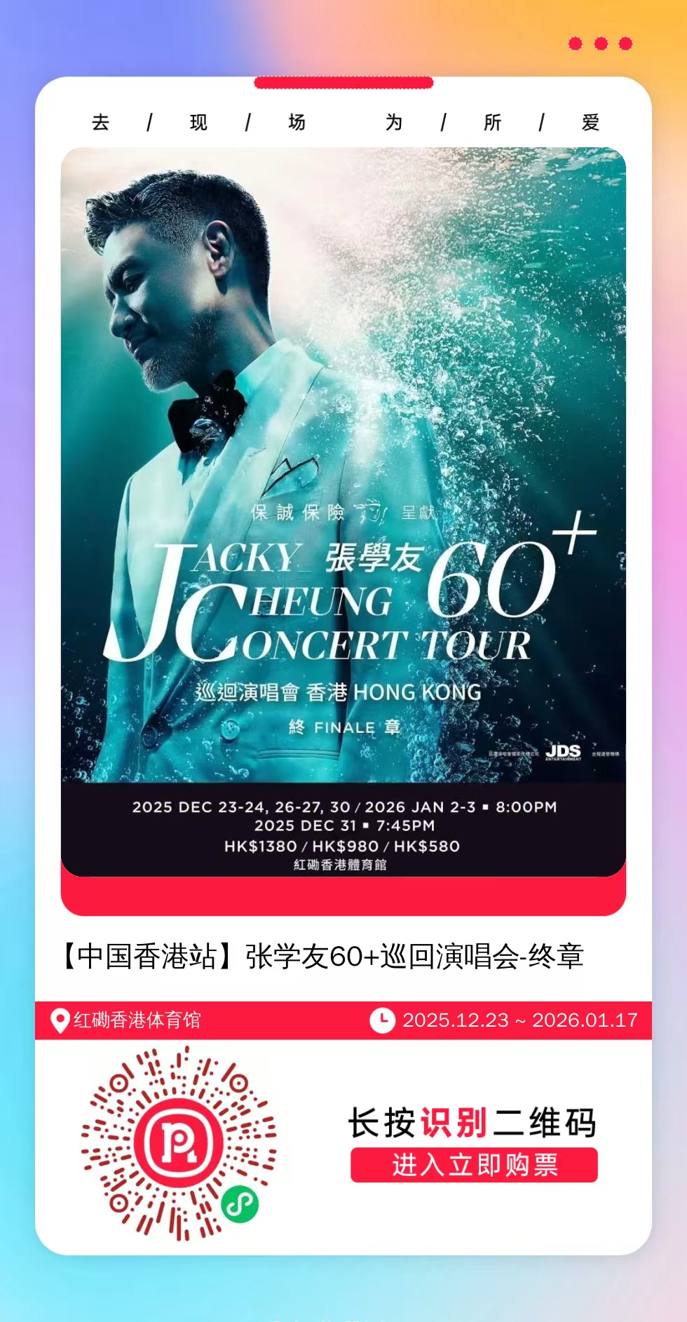 购票提醒:直接打开左侧海报(鼠标移动到海报上,右键选择“在新标签页打开图片”),用手机打开微信扫描海报中的二维码,扫描之后手机登录即可购票。如有疑问,可加微信cary7790咨询,下单后全程跟单,跟进一切关于门票的问题。