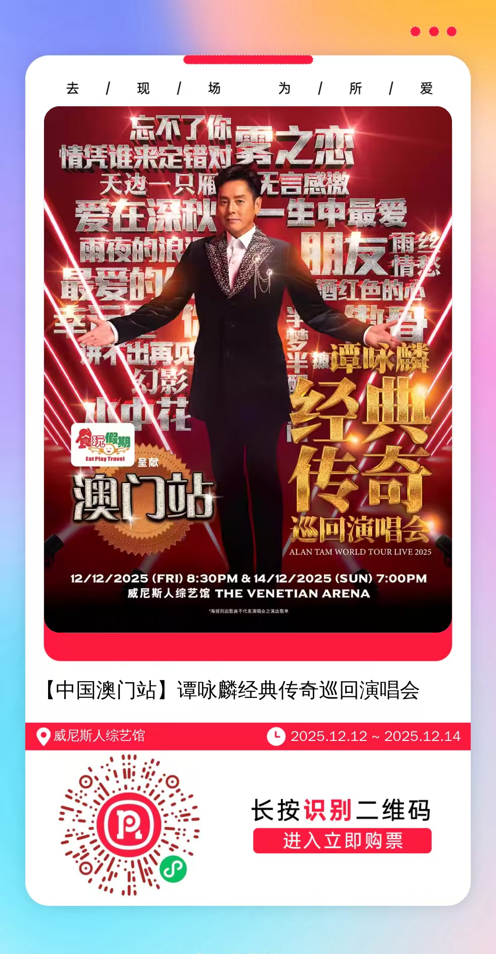 购票提醒:直接打开左侧海报(鼠标移动到海报上,右键选择“在新标签页打开图片”),用手机打开微信扫描海报中的二维码,扫描之后手机登录即可购票。如有疑问,可加微信cary7790咨询,下单后全程跟单,跟进一切关于门票的问题。