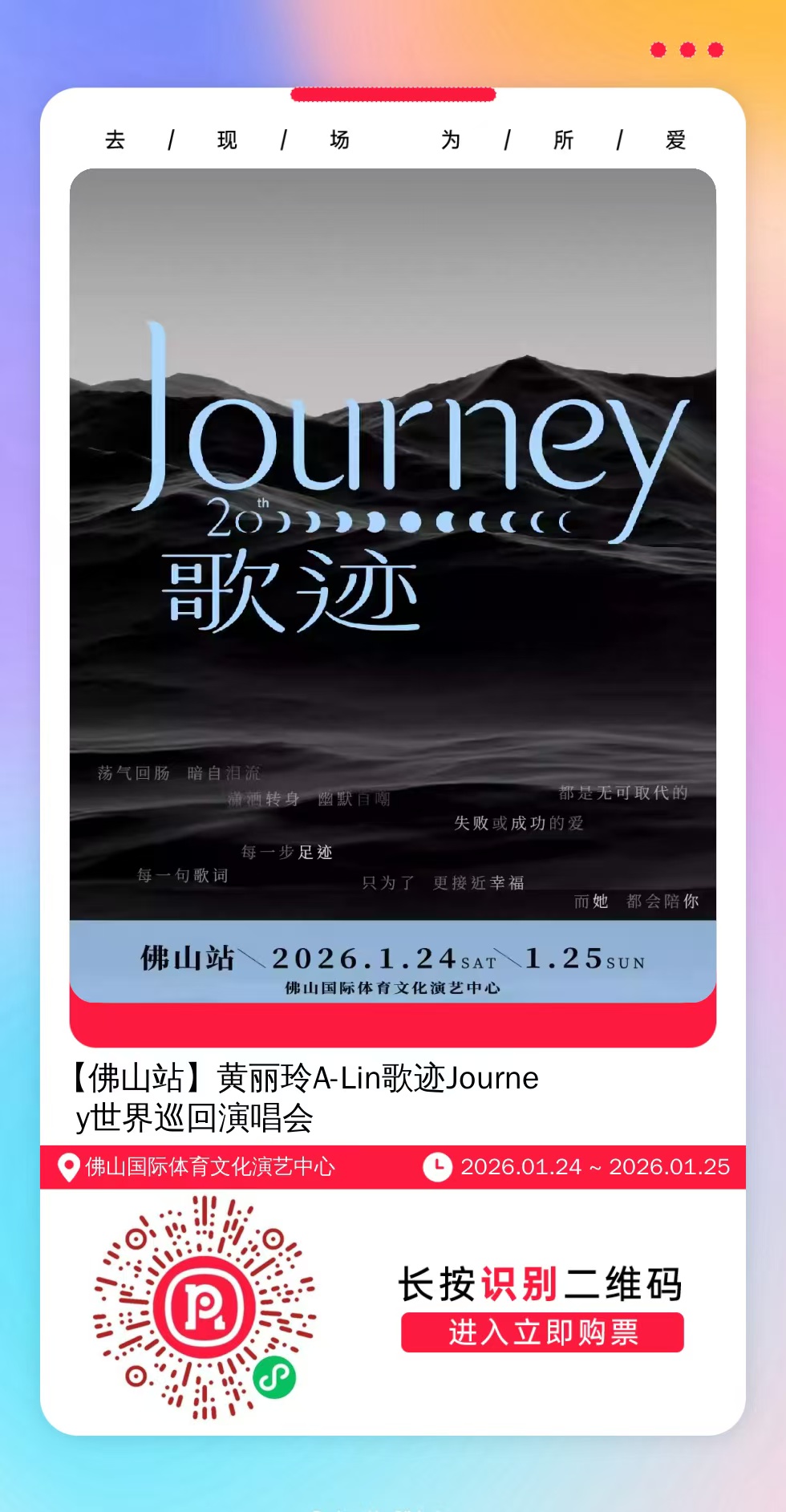 购票提醒:直接打开左侧海报(鼠标移动到海报上,右键选择“在新标签页打开图片”),用手机打开微信扫描海报中的二维码,扫描之后手机登录即可购票。如有疑问,可加微信cary7790咨询,下单后全程跟单,跟进一切关于门票的问题。