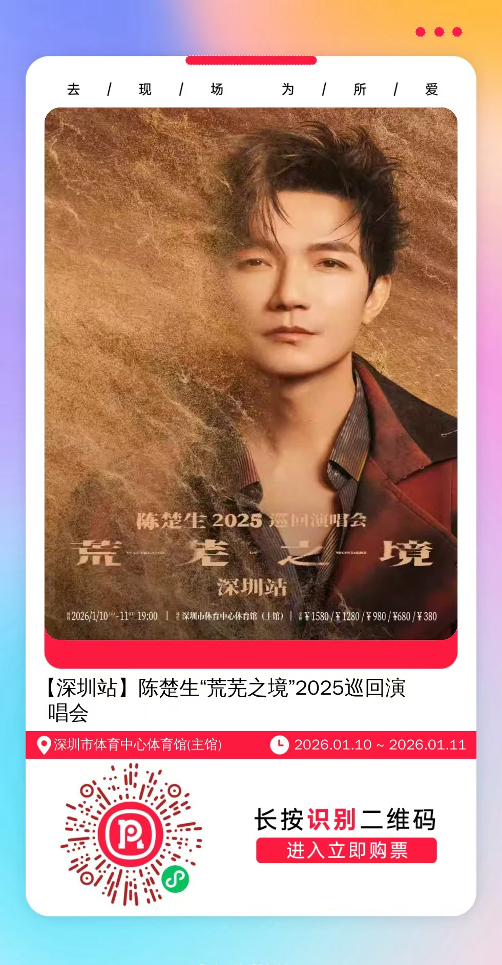 购票提醒:将左侧海报保存至手机,打开微信扫一扫,选择手机相册中保存的海报,扫描之后手机登录即可购票。如有疑问,可加微信cary7790咨询,下单后全程跟单,跟进一切关于门票的问题。