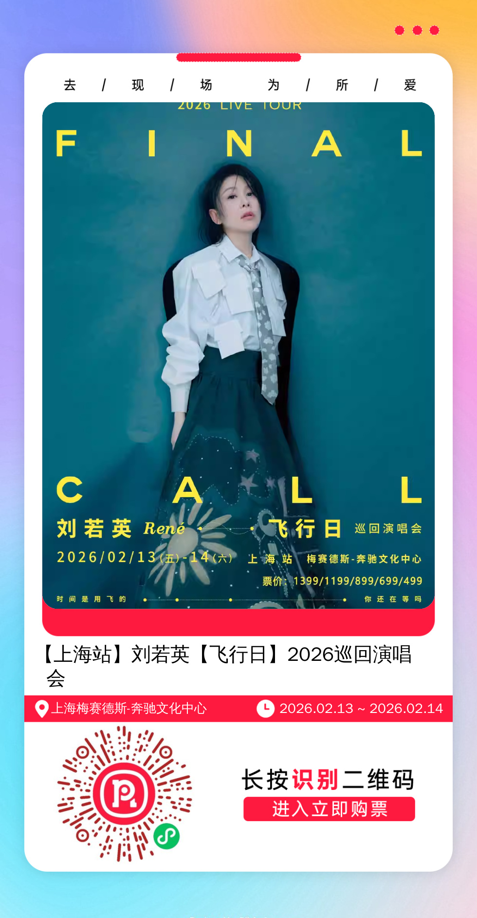 购票提醒:直接打开左侧海报(鼠标移动到海报上,右键选择“在新标签页打开图片”),用手机打开微信扫描海报中的二维码,扫描之后手机登录即可购票。如有疑问,可加微信cary7790咨询,下单后全程跟单,跟进一切关于门票的问题。