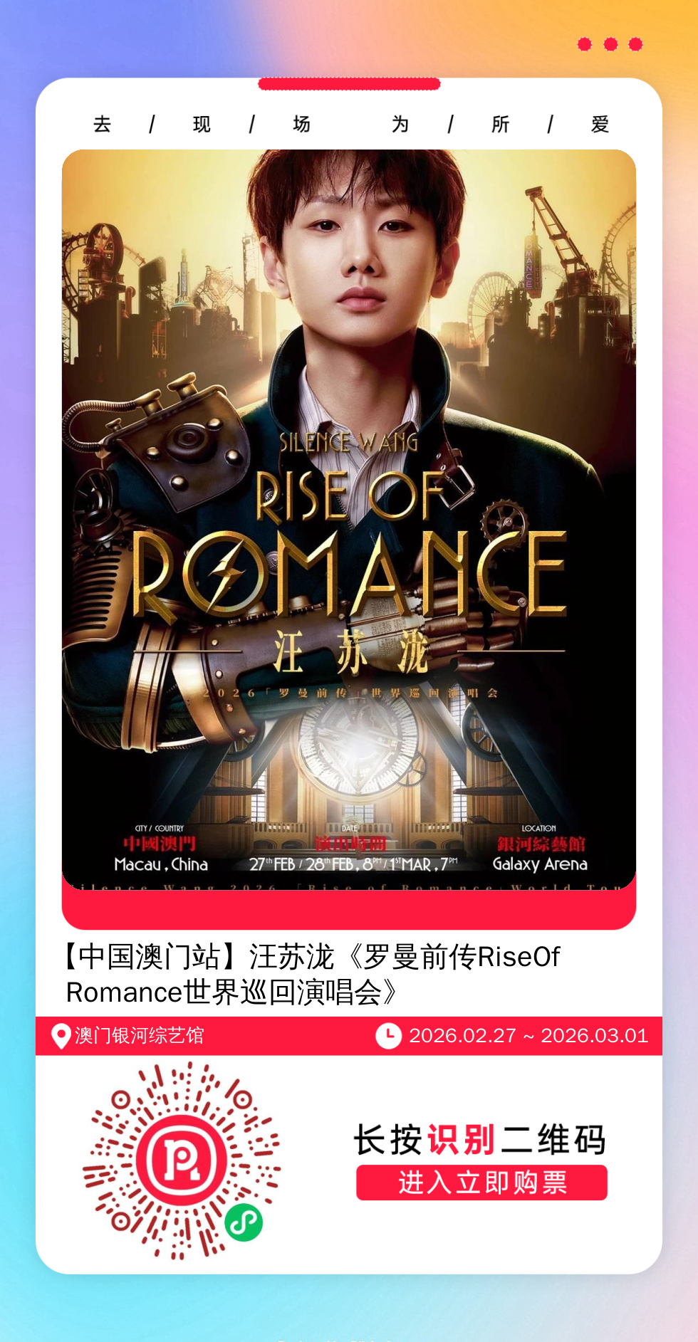 购票提醒:直接打开左侧海报(鼠标移动到海报上,右键选择“在新标签页打开图片”),用手机打开微信扫描海报中的二维码,扫描之后手机登录即可购票。如有疑问,可加微信cary7790咨询,下单后全程跟单,跟进一切关于门票的问题。