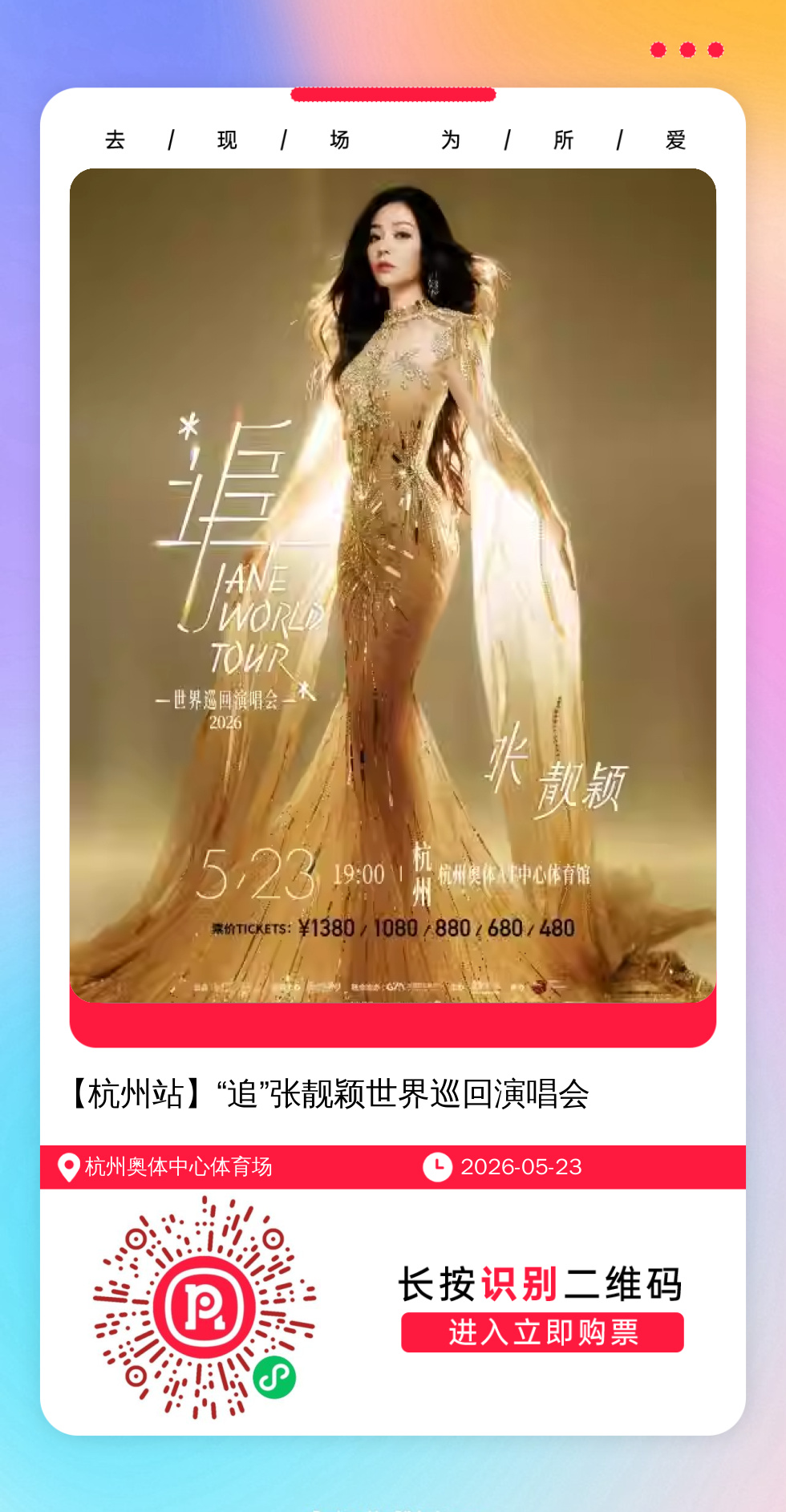 微信扫一扫打赏权益1:门票开售前单独提醒,不错过抢票时间,可咨询任何歌手近期演唱会。