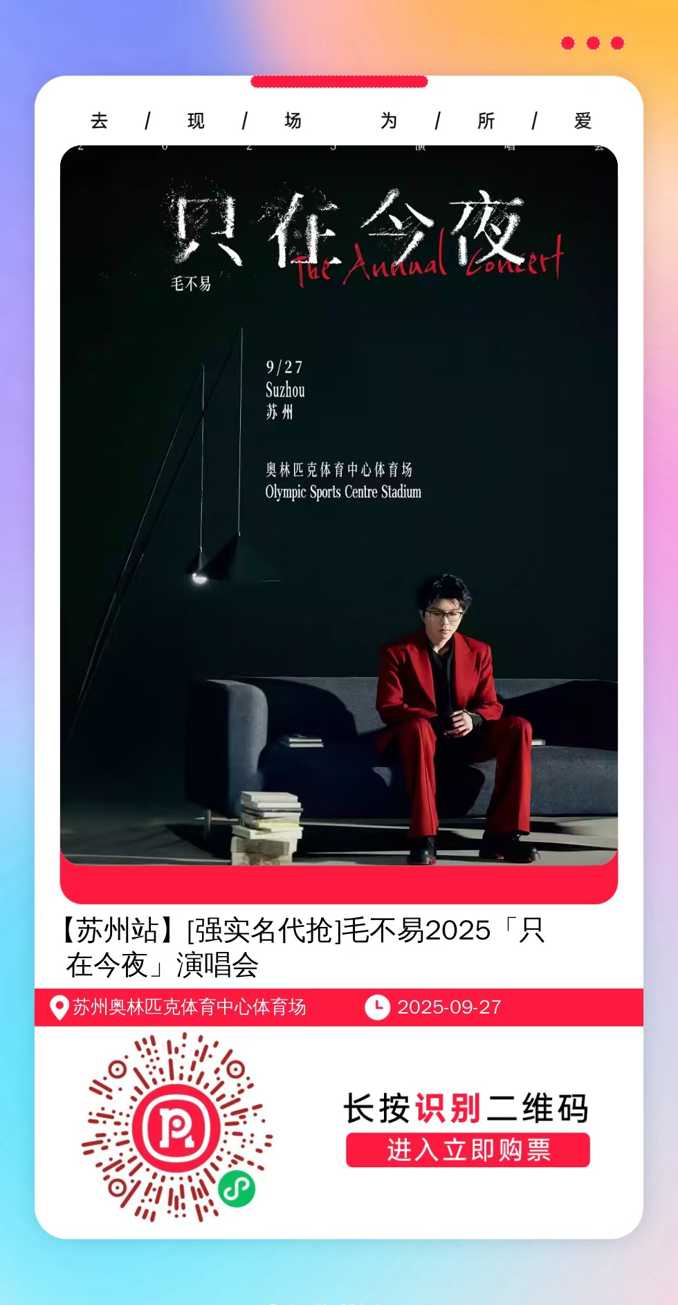 购票提醒:直接打开左侧海报(鼠标移动到海报上,右键选择“在新标签页打开图片”),用手机打开微信扫描海报中的二维码,扫描之后手机登录即可购票。如有疑问,可加微信cary7790咨询,下单后全程跟单,跟进一切关于门票的问题。